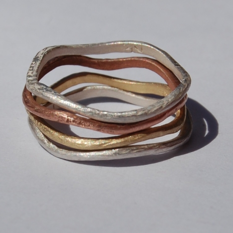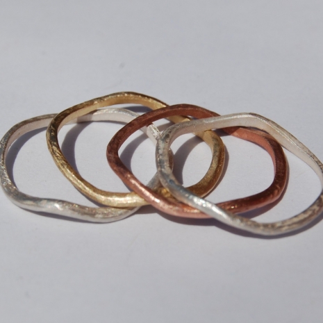 One is 10kt Rose Gold, 1 is 10kt Yellow Gold and two are sterling silver. Stack all four together or wear just 2 or three at a time. Many choices and combinations to give you a unique piece of jewelry- beautiful and dressy yet suitable for everyday.